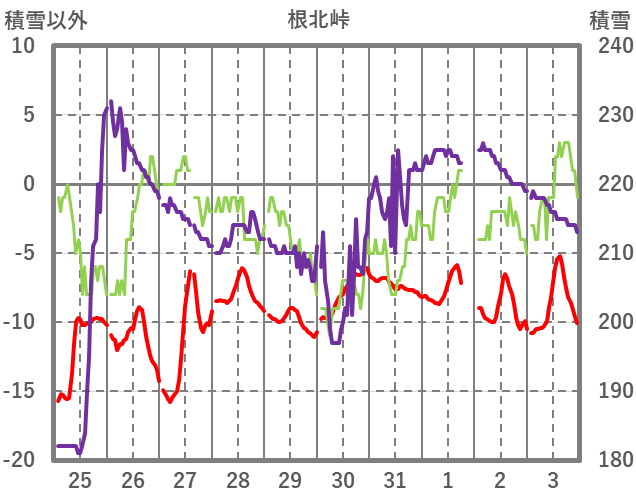 | 日 | 時 | 気温 | 降水 | 風向/風速 | 日照 | 積雪 | 降雪 |