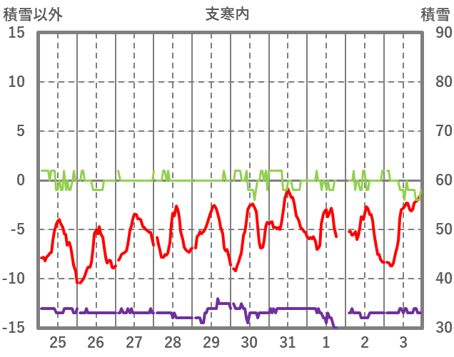 | 日 | 時 | 気温 | 降水 | 風向/風速 | 日照 | 積雪 | 降雪 |