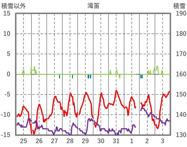 | 日 | 時 | 気温 | 降水 | 風向/風速 | 日照 | 積雪 | 降雪 |