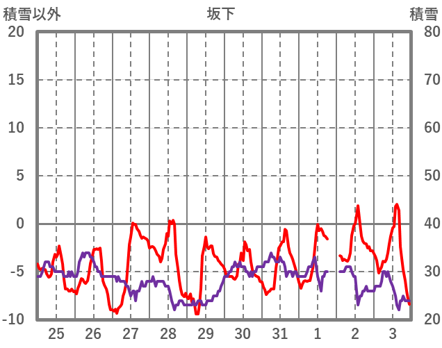 | 日 | 時 | 気温 | 降水 | 風向/風速 | 日照 | 積雪 | 降雪 |