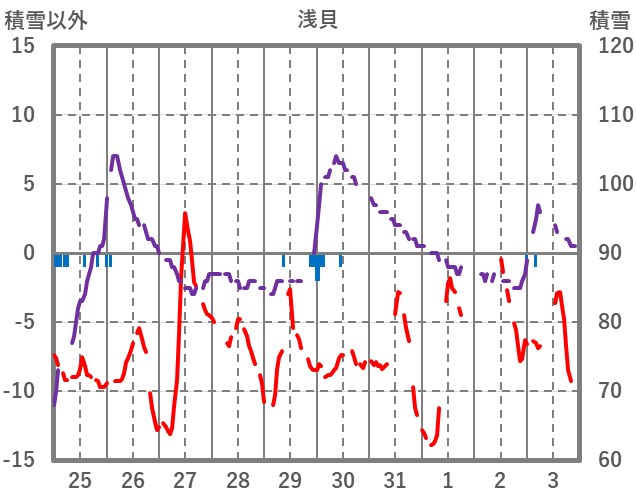 | 日 | 時 | 気温 | 降水 | 風向/風速 | 日照 | 積雪 | 降雪 |