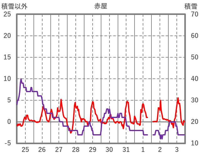 | 日 | 時 | 気温 | 降水 | 風向/風速 | 日照 | 積雪 | 降雪 |