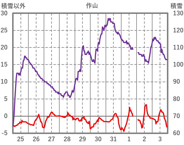 | 日 | 時 | 気温 | 降水 | 風向/風速 | 日照 | 積雪 | 降雪 |