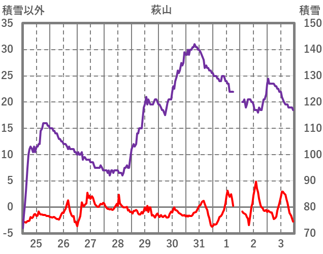 | 日 | 時 | 気温 | 降水 | 風向/風速 | 日照 | 積雪 | 降雪 |