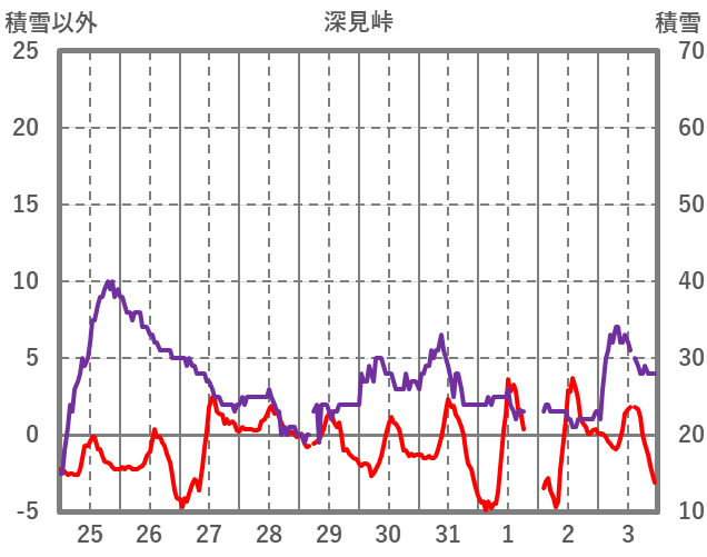 | 日 | 時 | 気温 | 降水 | 風向/風速 | 日照 | 積雪 | 降雪 |