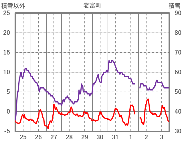 | 日 | 時 | 気温 | 降水 | 風向/風速 | 日照 | 積雪 | 降雪 |