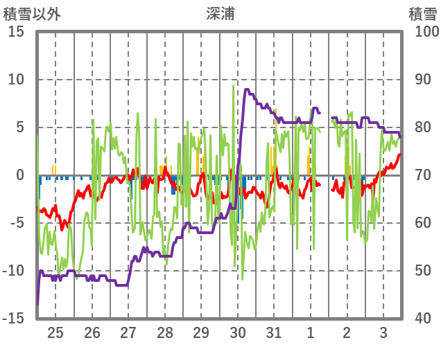 | 日 | 時 | 気温 | 降水 | 風向/風速 | 日照 | 積雪 | 降雪 |