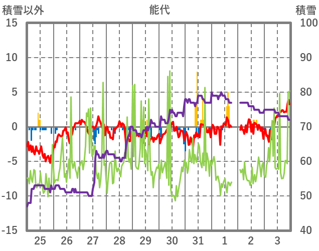 | 日 | 時 | 気温 | 降水 | 風向/風速 | 日照 | 積雪 | 降雪 |