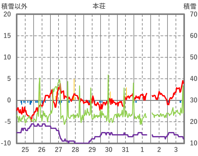 | 日 | 時 | 気温 | 降水 | 風向/風速 | 日照 | 積雪 | 降雪 |