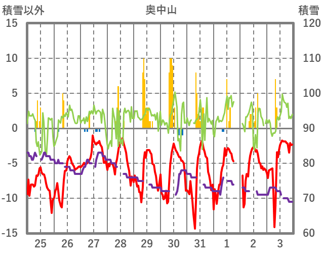 | 日 | 時 | 気温 | 降水 | 風向/風速 | 日照 | 積雪 | 降雪 |