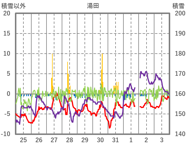 | 日 | 時 | 気温 | 降水 | 風向/風速 | 日照 | 積雪 | 降雪 |