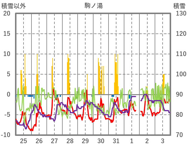 | 日 | 時 | 気温 | 降水 | 風向/風速 | 日照 | 積雪 | 降雪 |
