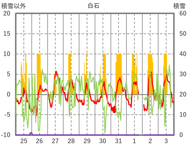 | 日 | 時 | 気温 | 降水 | 風向/風速 | 日照 | 積雪 | 降雪 |
