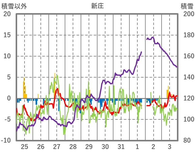 | 日 | 時 | 気温 | 降水 | 風向/風速 | 日照 | 積雪 | 降雪 |