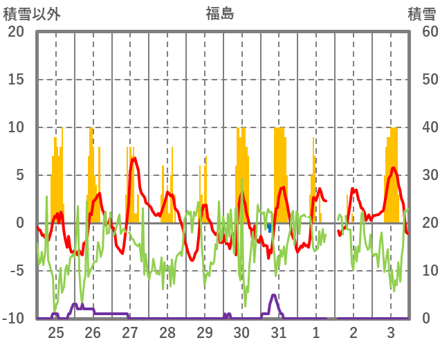 | 日 | 時 | 気温 | 降水 | 風向/風速 | 日照 | 積雪 | 降雪 |