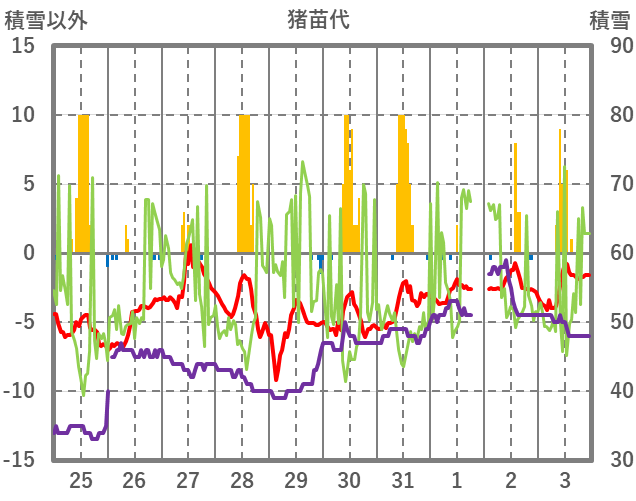 | 日 | 時 | 気温 | 降水 | 風向/風速 | 日照 | 積雪 | 降雪 |