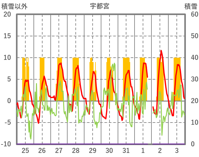 | 日 | 時 | 気温 | 降水 | 風向/風速 | 日照 | 積雪 | 降雪 |