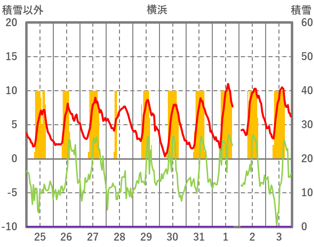 | 日 | 時 | 気温 | 降水 | 風向/風速 | 日照 | 積雪 | 降雪 |