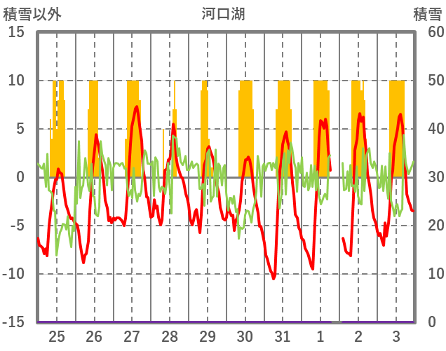 | 日 | 時 | 気温 | 降水 | 風向/風速 | 日照 | 積雪 | 降雪 |