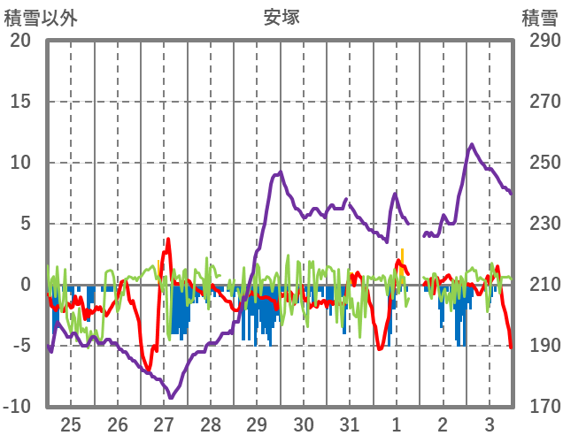 | 日 | 時 | 気温 | 降水 | 風向/風速 | 日照 | 積雪 | 降雪 |