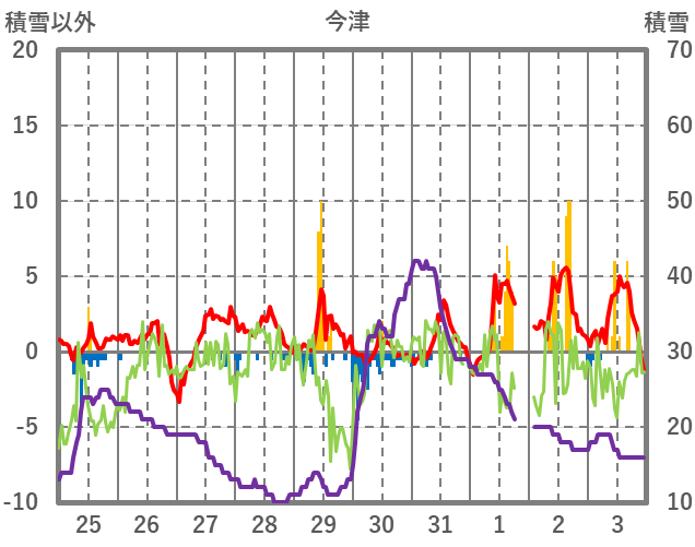 | 日 | 時 | 気温 | 降水 | 風向/風速 | 日照 | 積雪 | 降雪 |