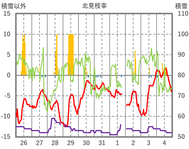 | 日 | 時 | 気温 | 降水 | 風向/風速 | 日照 | 積雪 | 降雪 |
