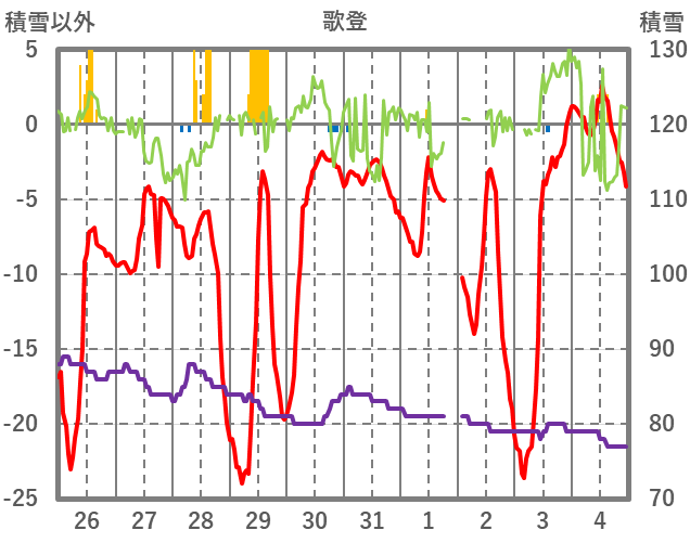 | 日 | 時 | 気温 | 降水 | 風向/風速 | 日照 | 積雪 | 降雪 |
