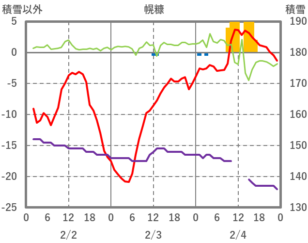 | 日 | 時 | 気温 | 降水 | 風向/風速 | 日照 | 積雪 | 降雪 |