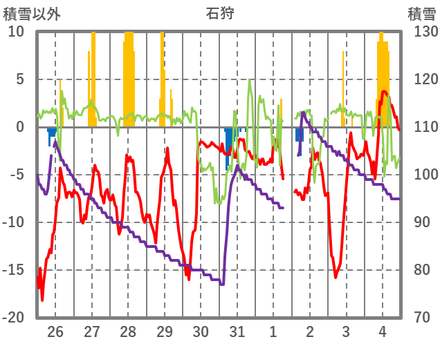 | 日 | 時 | 気温 | 降水 | 風向/風速 | 日照 | 積雪 | 降雪 |