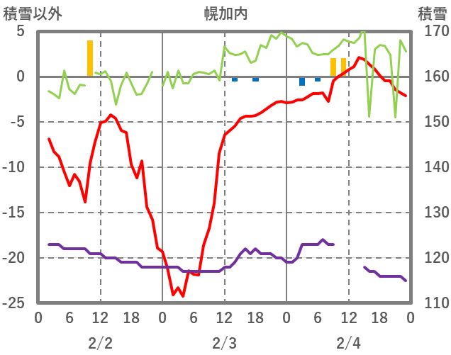 | 日 | 時 | 気温 | 降水 | 風向/風速 | 日照 | 積雪 | 降雪 |