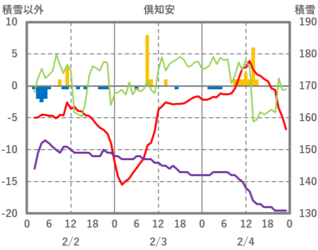 | 日 | 時 | 気温 | 降水 | 風向/風速 | 日照 | 積雪 | 降雪 |