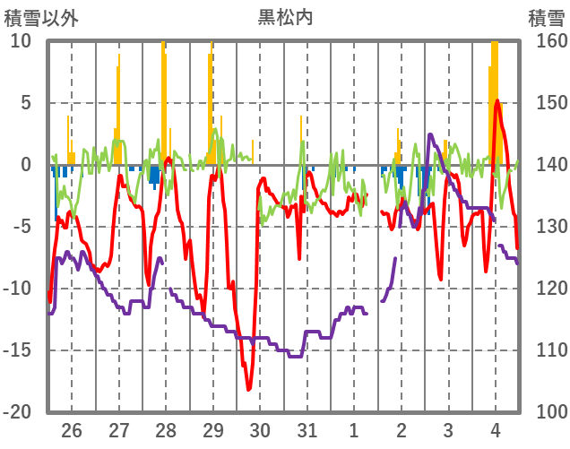 | 日 | 時 | 気温 | 降水 | 風向/風速 | 日照 | 積雪 | 降雪 |