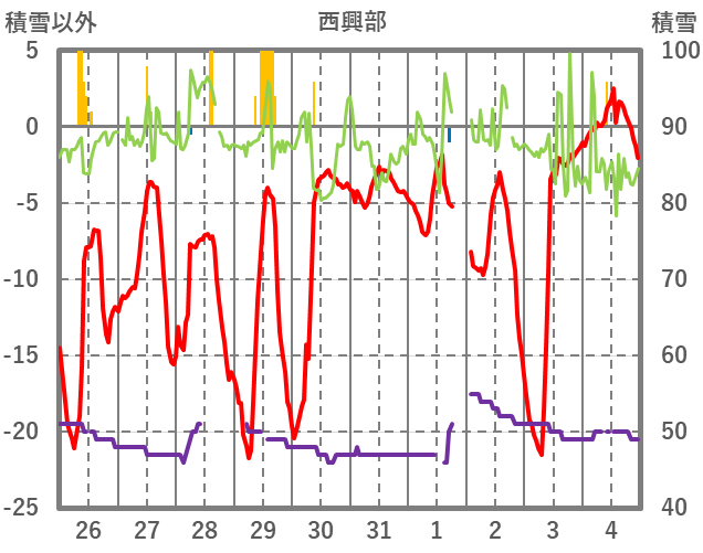 | 日 | 時 | 気温 | 降水 | 風向/風速 | 日照 | 積雪 | 降雪 |