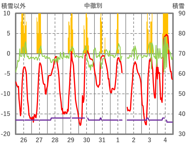 | 日 | 時 | 気温 | 降水 | 風向/風速 | 日照 | 積雪 | 降雪 |