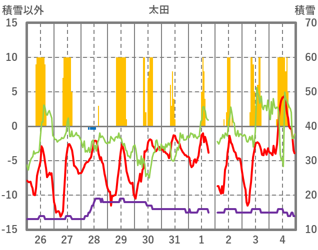 | 日 | 時 | 気温 | 降水 | 風向/風速 | 日照 | 積雪 | 降雪 |