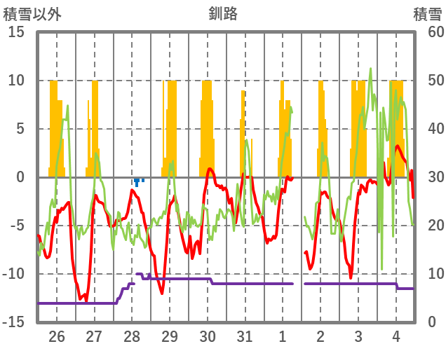 | 日 | 時 | 気温 | 降水 | 風向/風速 | 日照 | 積雪 | 降雪 |