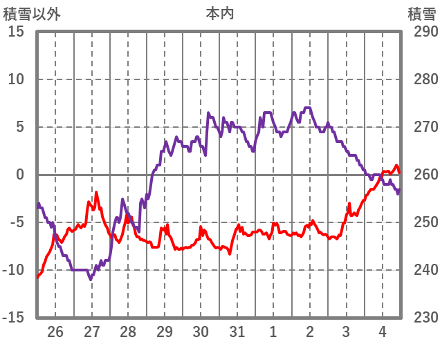 | 日 | 時 | 気温 | 降水 | 風向/風速 | 日照 | 積雪 | 降雪 |
