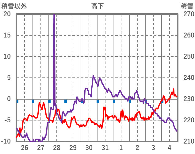 | 日 | 時 | 気温 | 降水 | 風向/風速 | 日照 | 積雪 | 降雪 |