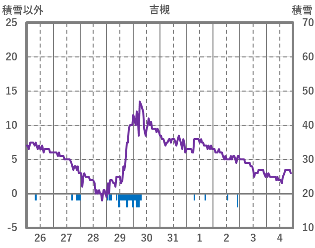 | 日 | 時 | 気温 | 降水 | 風向/風速 | 日照 | 積雪 | 降雪 |