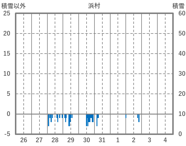 | 日 | 時 | 気温 | 降水 | 風向/風速 | 日照 | 積雪 | 降雪 |