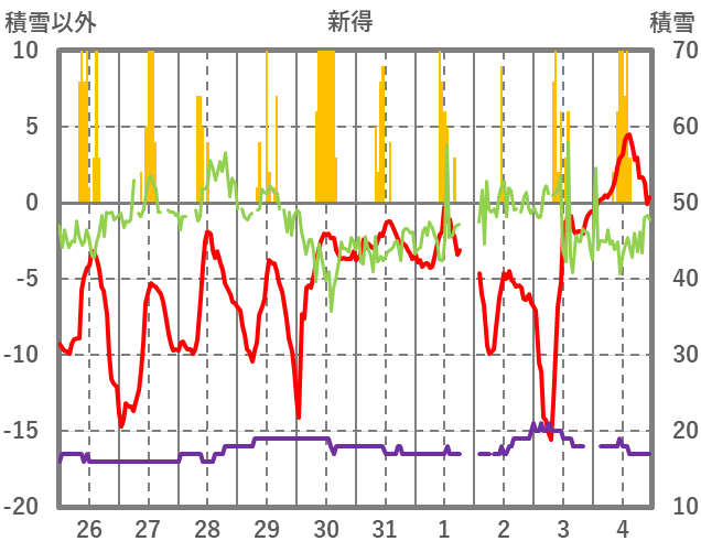 | 日 | 時 | 気温 | 降水 | 風向/風速 | 日照 | 積雪 | 降雪 |