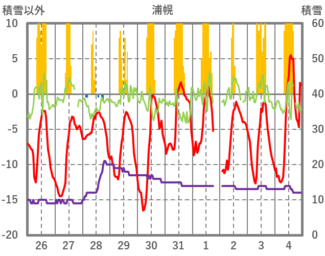 | 日 | 時 | 気温 | 降水 | 風向/風速 | 日照 | 積雪 | 降雪 |
