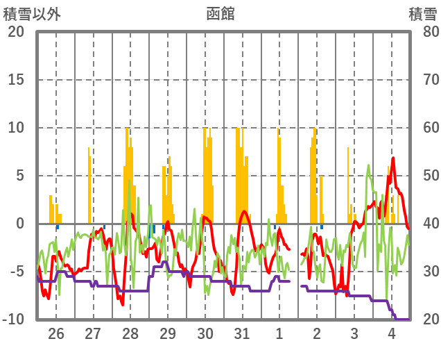 | 日 | 時 | 気温 | 降水 | 風向/風速 | 日照 | 積雪 | 降雪 |
