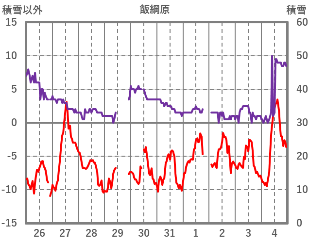 | 日 | 時 | 気温 | 降水 | 風向/風速 | 日照 | 積雪 | 降雪 |