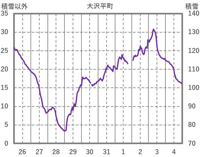 | 日 | 時 | 気温 | 降水 | 風向/風速 | 日照 | 積雪 | 降雪 |