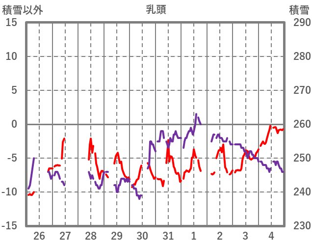 | 日 | 時 | 気温 | 降水 | 風向/風速 | 日照 | 積雪 | 降雪 |