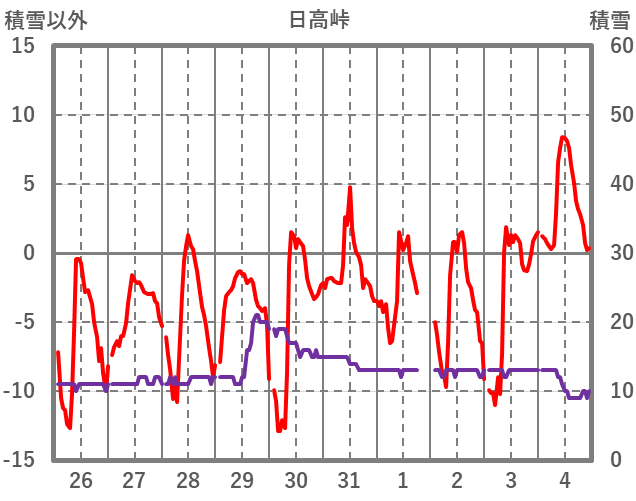 | 日 | 時 | 気温 | 降水 | 風向/風速 | 日照 | 積雪 | 降雪 |