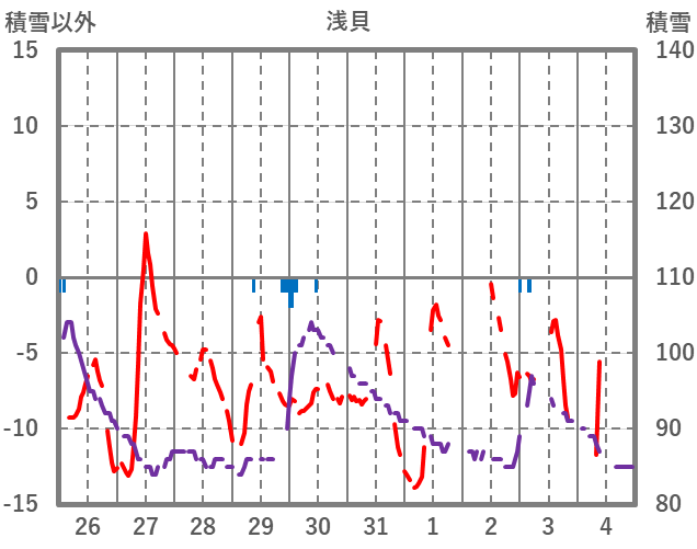 | 日 | 時 | 気温 | 降水 | 風向/風速 | 日照 | 積雪 | 降雪 |