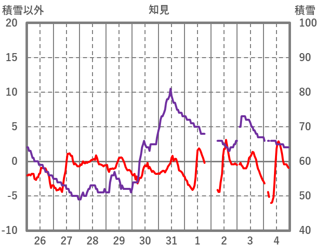 | 日 | 時 | 気温 | 降水 | 風向/風速 | 日照 | 積雪 | 降雪 |