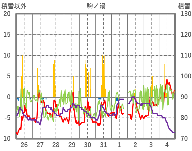 | 日 | 時 | 気温 | 降水 | 風向/風速 | 日照 | 積雪 | 降雪 |